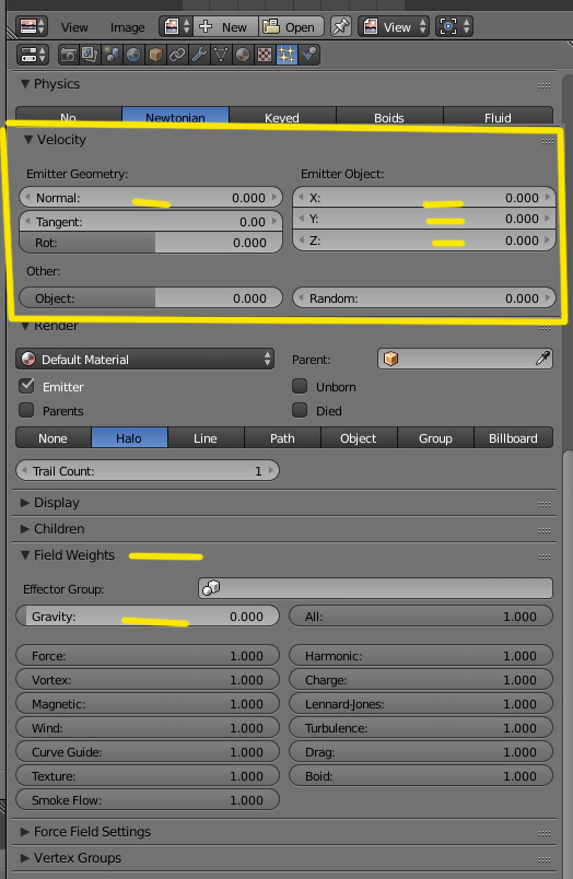 Tienes que ponerle valor a la NORMAL de CERO los EMITTER OBJECT a CERO y en FIELD WEIGHTS la GRAVEDAD (Gravity) a CERO.