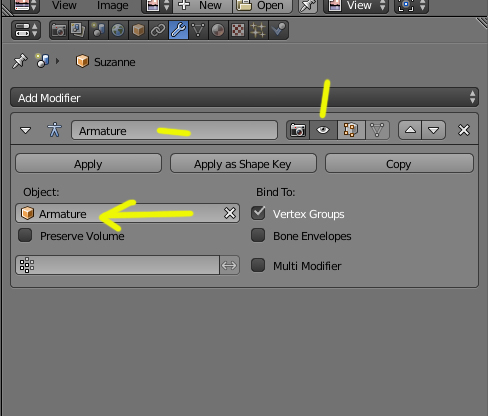 Si no lo tienes, crea uno nuevo desde Add Modifier > Armature y debes de poner el nombre de la armature.