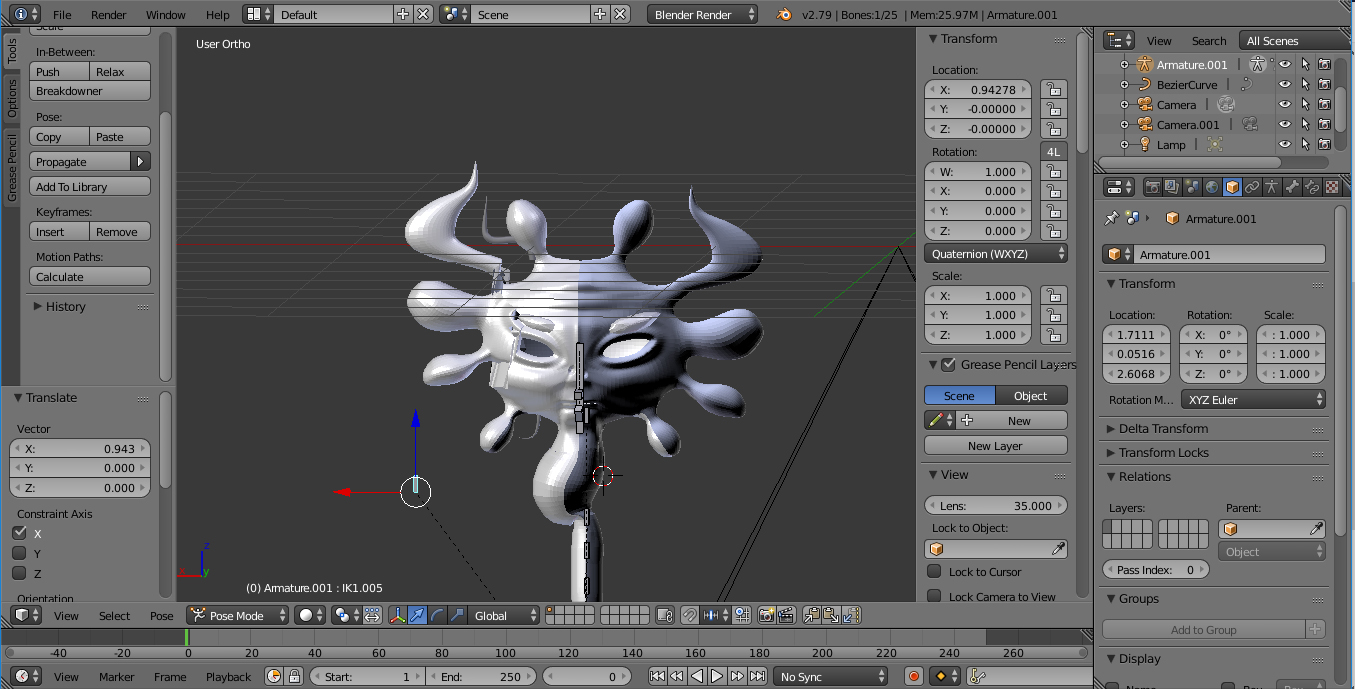 La primera vez salió todo bien haciendo las poses, pero las intersecciones de la cola en las que estaba dividida la armadura o esqueleto de mi gusano me parecían pocas para darle esa fluidez, entonces decidí sobre el mismo proyecto borrar la antigua armadura y crear una nueva con mas intersecciones siguiendo el mismo tuto. Ahora resulta que estando en el PoseMode si muevo una de las intersecciones mitad de la cara se queda en la misma posición.