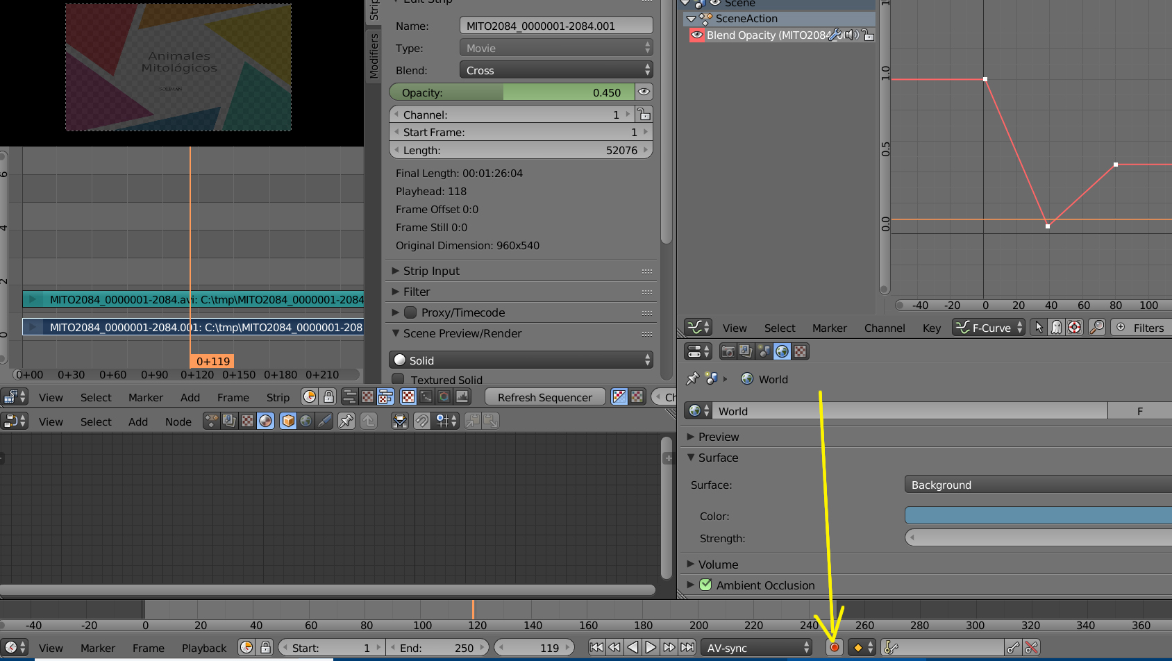 Al copiar la escena se copiaron también las pistas ANL de la escena original. Borrándolas desde la ventana de Listado ya pueden trabajarse los keyframes debidamente. Me falta comprender algunas funciones básicas de Blender que, al iniciarme directamente con el editor de vídeo, todavía no controlo.