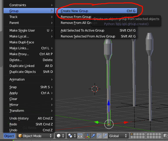 1) Con el modelo original de tu farola seleccionado, eliges del menú Object > Group > Create New Group. Así se creará el grupo \"Group\"
